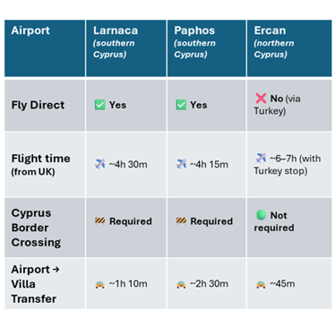 Flights to Northern Cyprus are possible to 3 airports (Larnaca, Paphos and Ercan), each with flights and typical transfers timings: