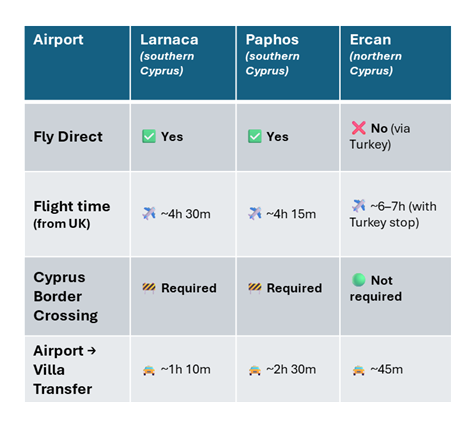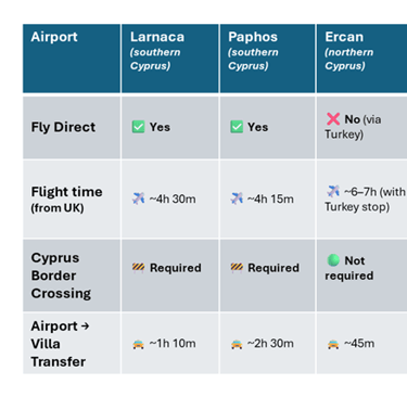 Flights to Northern Cyprus are possible to 3 airports (Larnaca, Paphos and Ercan), each with flights and typical transfers timings: